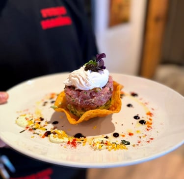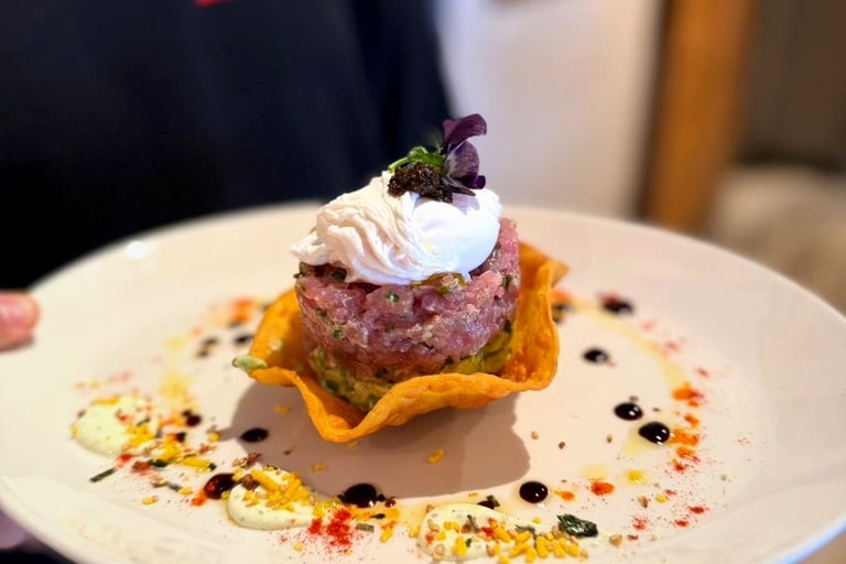 Tartar de atún con aguacate servido con huevo pochado, trufa y cesta de maíz – 17,00