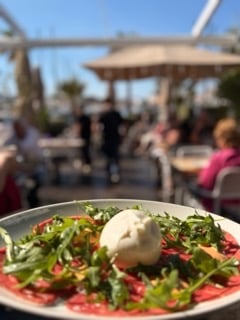 Carpaccio de ternera de buey con burrata servido con salsa de pimientos asados y anchoas alcaparras – 16,00